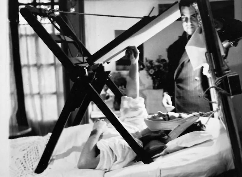 Frida Kahlo peignant sur son lit avec Miguel Covarrubias se tenant derrière elle