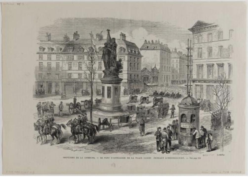 Anonyme , “Souvenirs de la Commune. Le parc d'artillerie de la place Clichy pendant l'insurrection.,” GPC Groupe 2, consulté le 17 décembre 2025, https://pireh.univ-paris1.fr/patrimoine/2023-2024/GPC/G2/items/show/107.