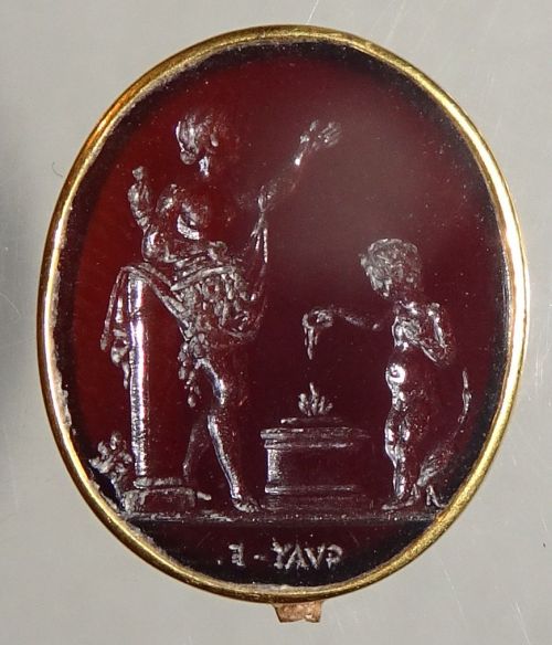 Un angelot debout à droite, un autel au centre et une jeune femme (Flore) debout à gauche.