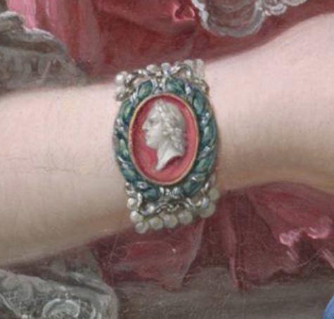 Madame de pompadour représentée de face, se maquillant et portant un camée (portrait de Louis XV) en bracelet.