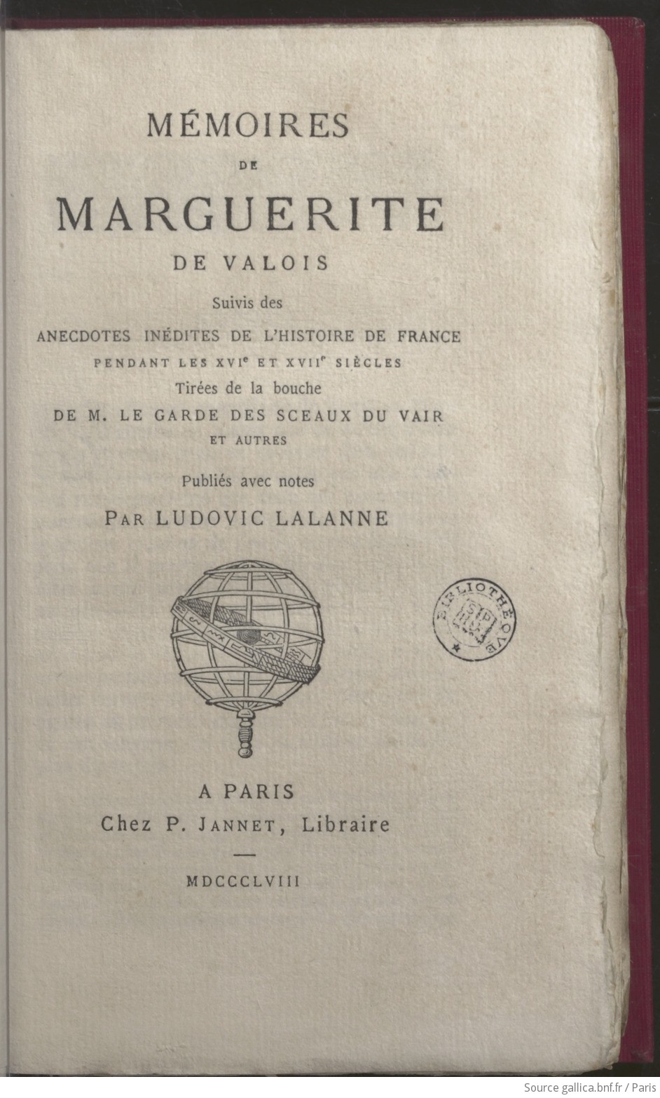 Marguerite de Valois , “Mémoires de Marguerite de Valois, suivis des Anecdotes inédites de l'histoire de France pendant les XVIe et XVIIe siècles,” Groupe 1, accessed December 18, 2025, https://pireh.univ-paris1.fr/patrimoine/2024-2025/GPC/G1/items/show/213.