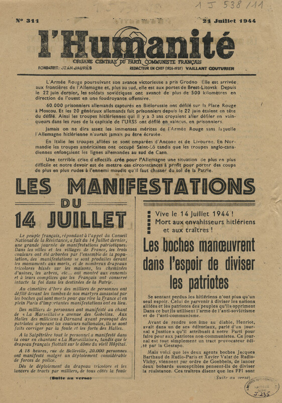 “L’Humanité, 21 juillet 1944,” GPC 2023-2024, accessed December 18, 2025, https://pireh.univ-paris1.fr/patrimoine/2024-2025/GPC/prof/items/show/119.