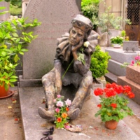 Une statue grandeur nature en pierre est entourée d'un soleil rayonnant qui ajoute une notion d'intemporalité et de vie à cette tombe. Le nom de Dalida est écrit en lettres dorées.