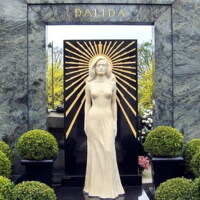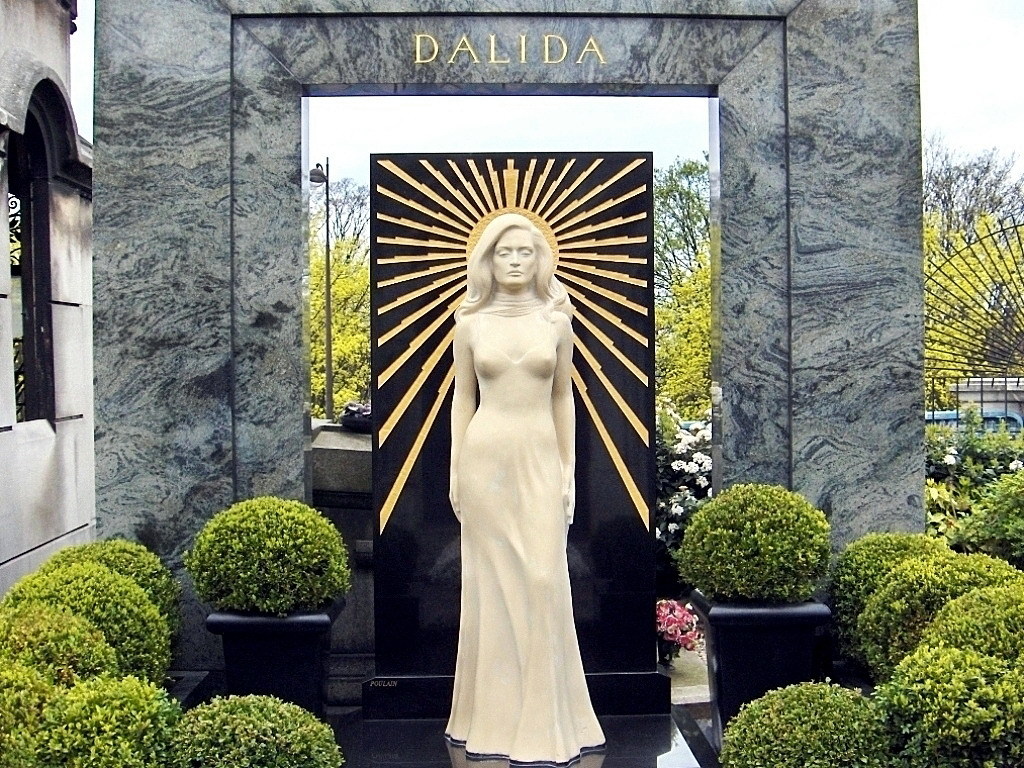 Une statue grandeur nature en pierre est entourée d'un soleil rayonnant qui ajoute une notion d'intemporalité et de vie à cette tombe. Le nom de Dalida est écrit en lettres dorées.