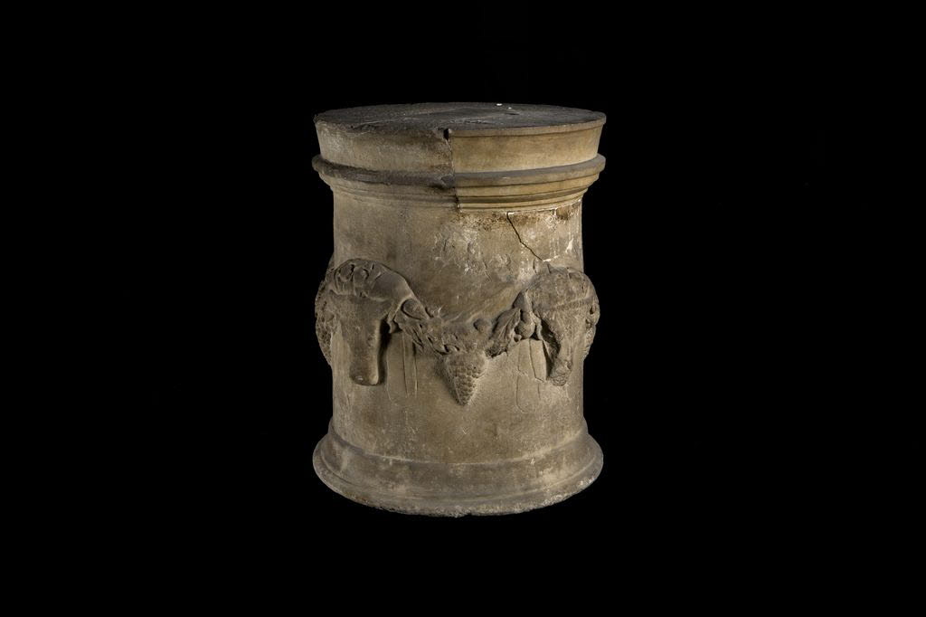 Autel cylindrique avec têtes de bœufs et guirlandes.
