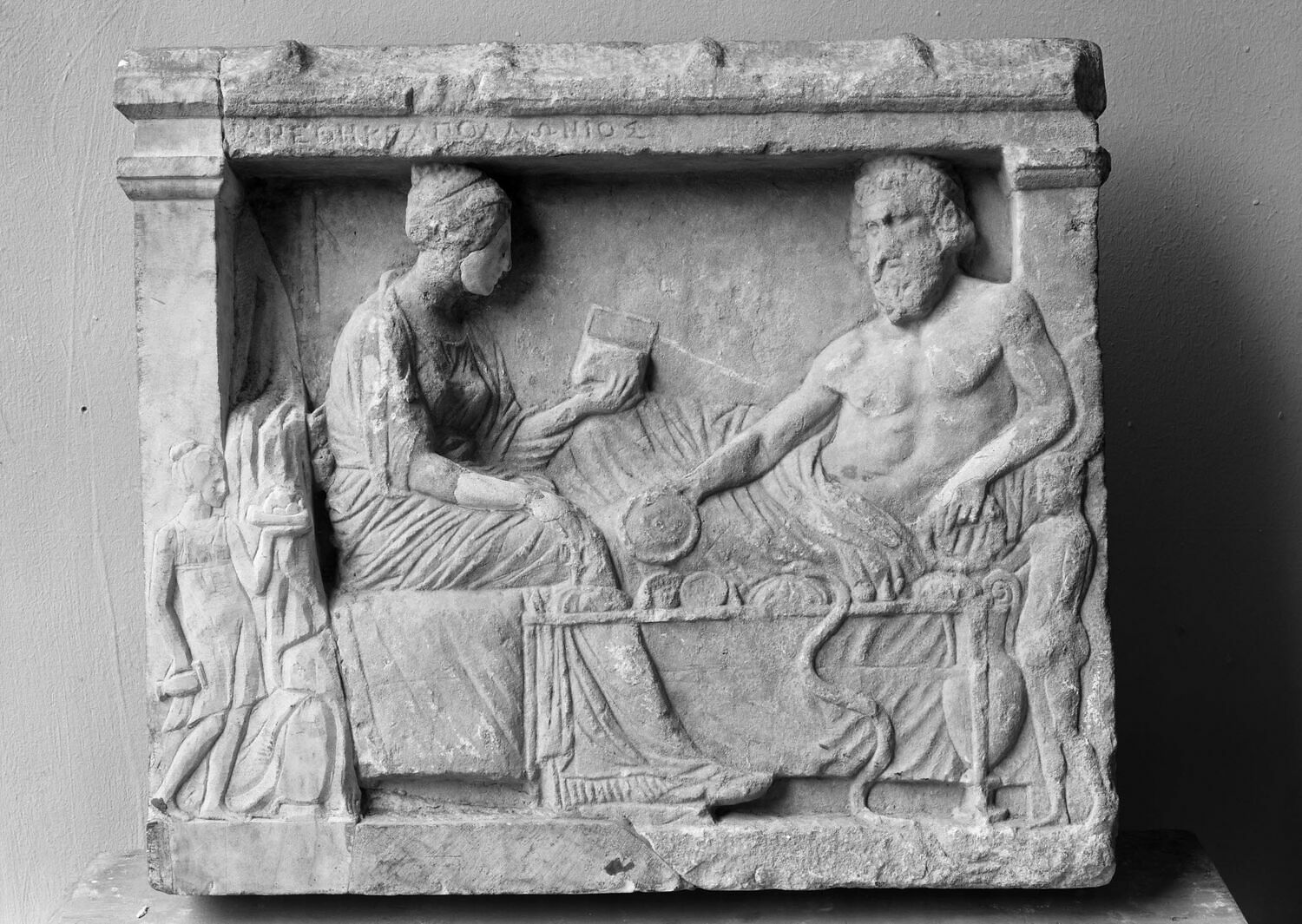 Relief votif en naïscos à antéfixes avec dédicace à un héros.