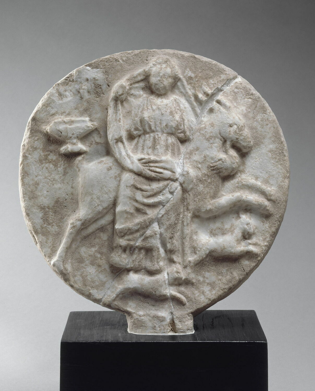 Relief d'Aphrodite Pandémos avec chèvre et deux chevreaux galopant.