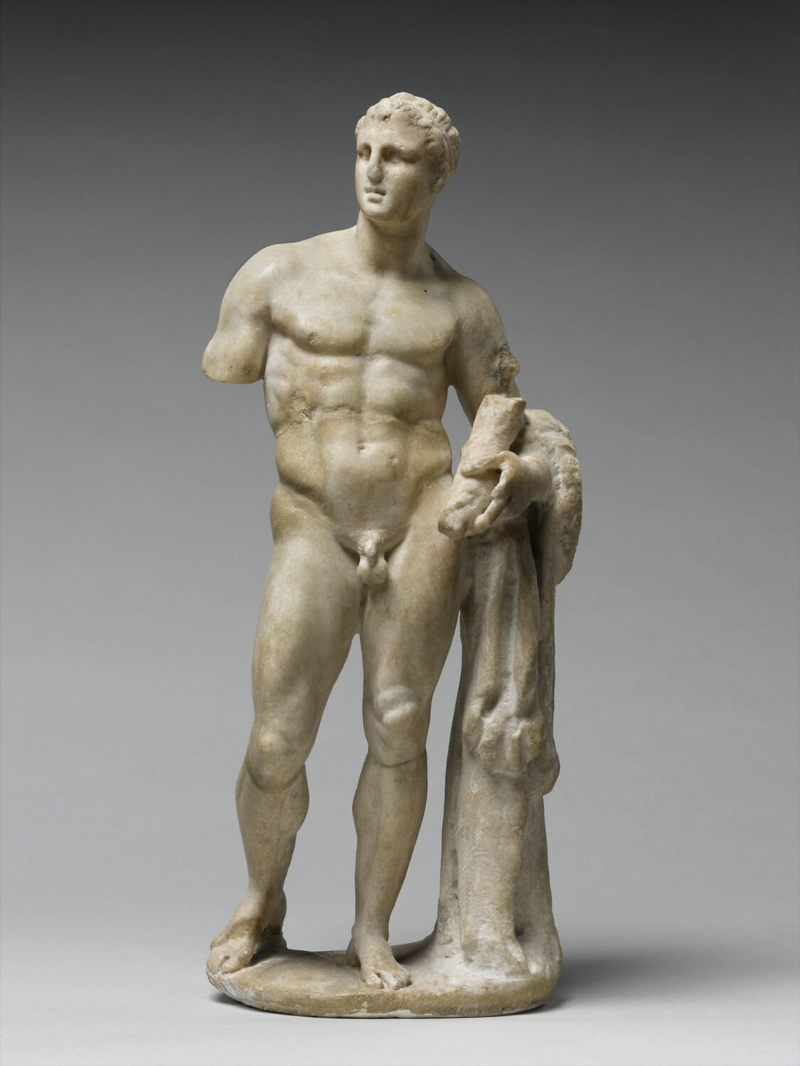 Statuette d'Héraclès nu appuyé sur un support où est posée la léonté.