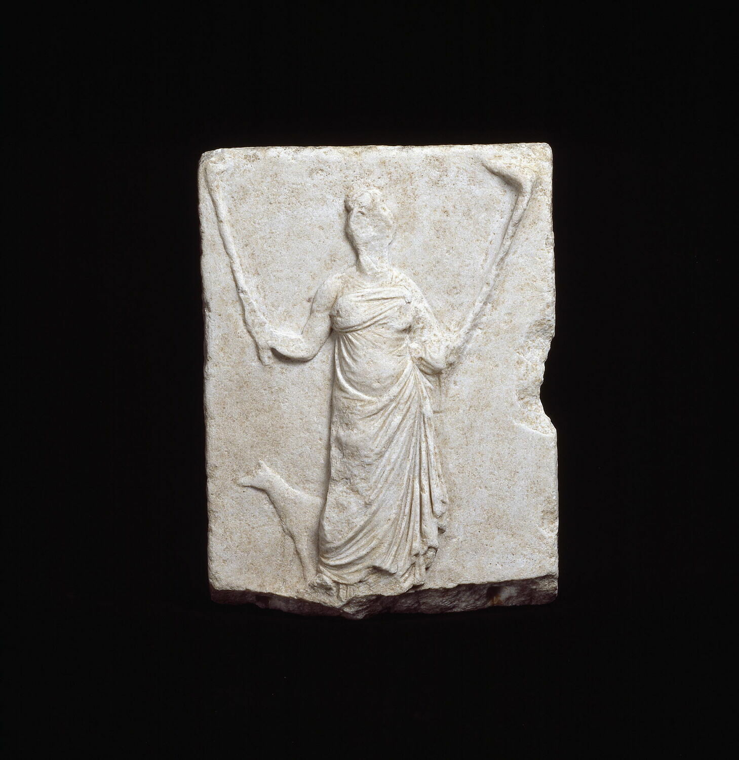 Relief votif représentant la déesse Hécate avec une torche allumée et un chien.