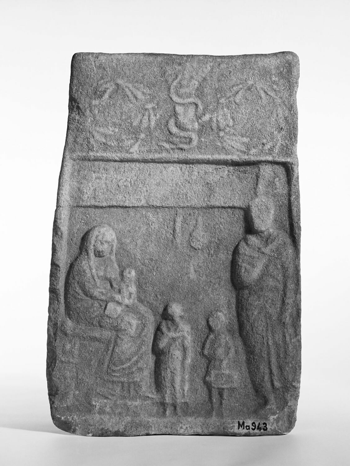 Stèle funéraire avec une scène d'adieux et une inscription : épitaphe.