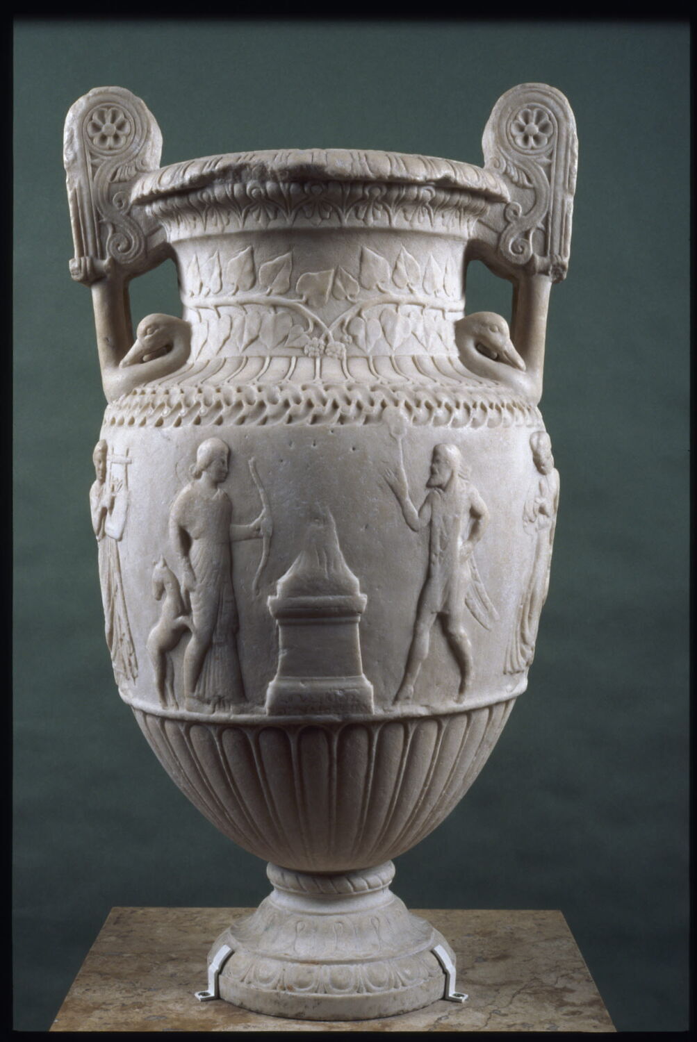 Cratère à volutes avec une inscription et des scènes mythologiques.