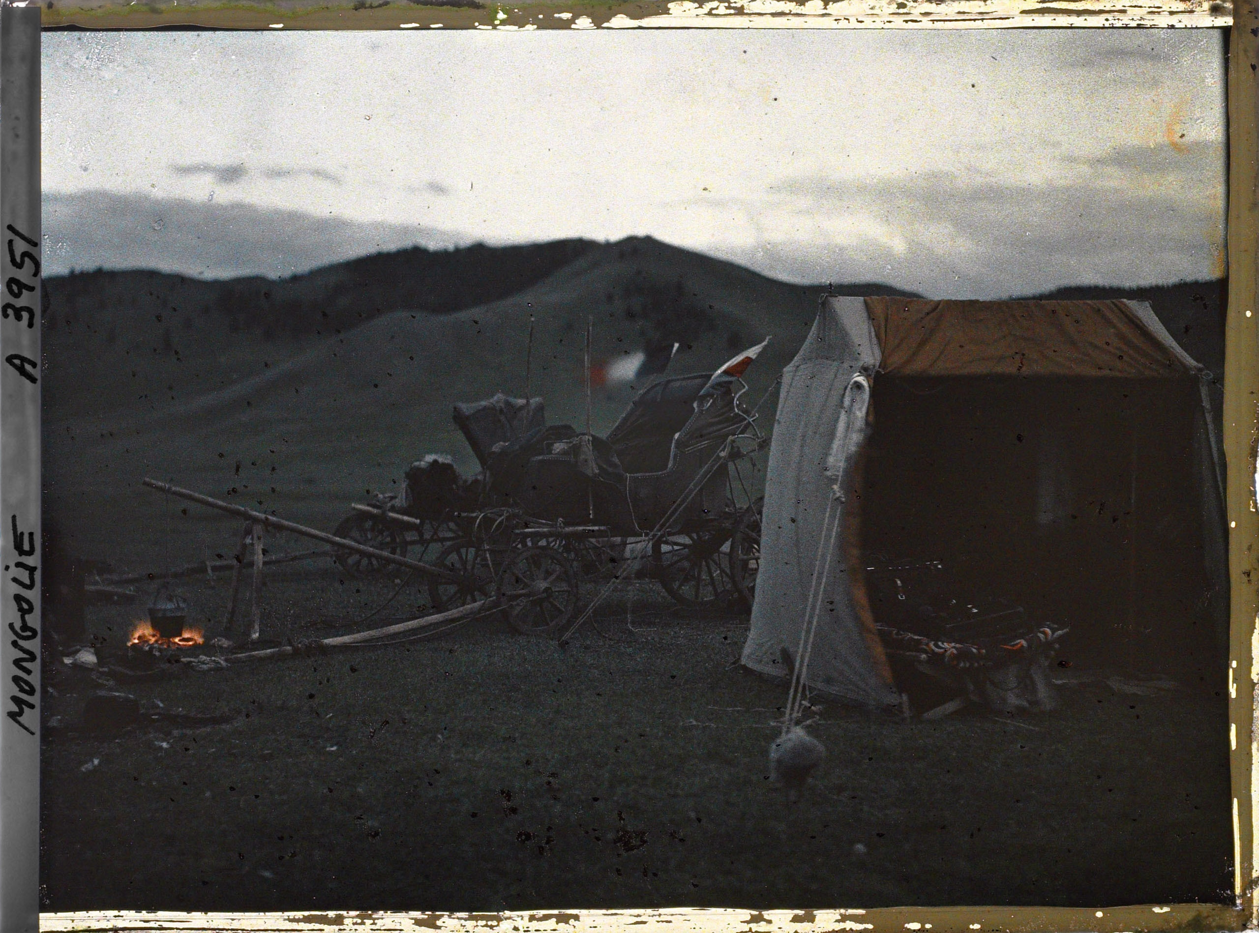 Le tente de l'opérateur et les deux voitures dételées près d'un feu destiné sans doute à la cuisson du repas