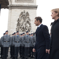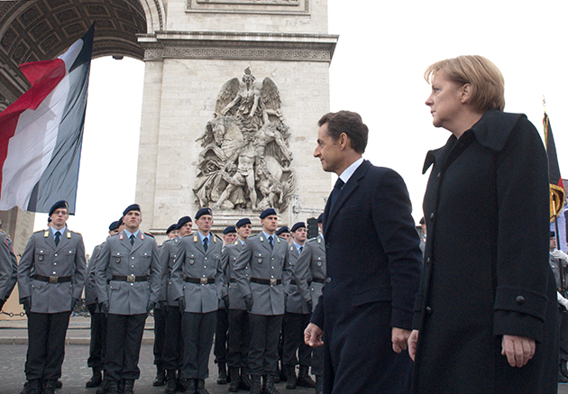 - Nicolas Sarkozy et Angela Merkel passent en revue des troupes allemandes à l’occasion de la cérémonie nationale du 11 Novembre 2009.