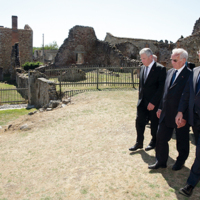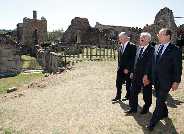 - François Hollande et Joachim Gauck visitent ensemble Oradour-sur-Glane, aux côtés de Robert Hebras, rescapé du massacre.