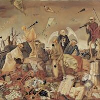 - Dans cet ultime tableau, qui rappelle une danse macabre médiévale, l'auteur exprime son attente d'une mort inévitable en peignant une scène de fin des temps. Nussbaum se sait déjà condamné : ce désespoir se reflète dans le paysage apocalyptique du tableau.