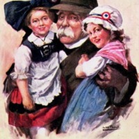 - Georges Clémenceau est représenté avec deux petites filles. L'une porte une coiffe arborant la cocarde tricolore, l'autre une coiffe traditionnelle alsacienne.
