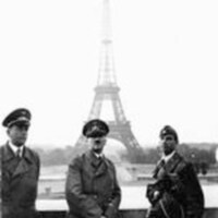 - Adolf Hitler pose devant la Tour Eiffel avec, à sa droite, l'architecte Albert Speer et, à sa gauche, le sculpteur Arno Breker. Le cliché est immortalisé par Heinrich Hoffmann, photographe du dirigeant nazi.