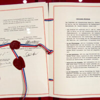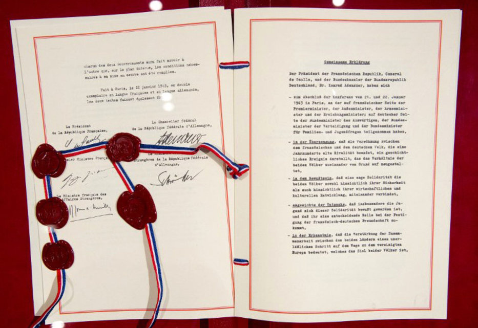 - Traité de réconciliation avec les signatures de Charles de Gaulle, Konrad Adenauer, Georges Pompidou, Gerhard Schroeder et Maurice Couve de Murville et des sceaux de cire.
