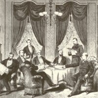 - Plusieurs représentants d'Etat, dont Jules favre et Otto von Bismarck, sont assis autour de la table des négociations.