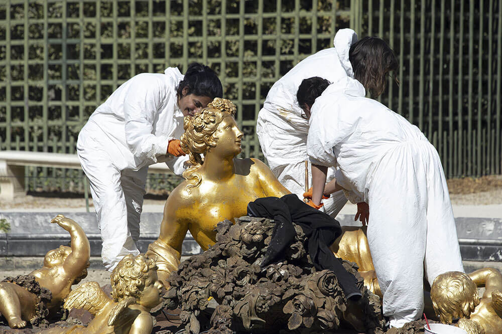 Les restauratrices, vêtues de leur combinaison blanche, sont juchées sur le groupe sculpté de Flore pour rendre leur fraîcheur aux roses et leur doré aux personnages.