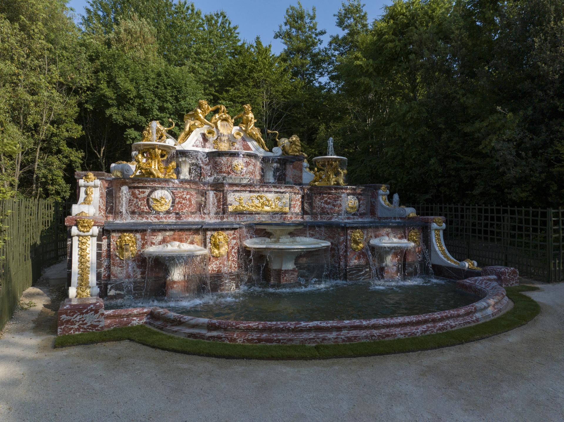 Vue d'ensemble du Buffet d'Eau après restauration, nymphes dorées versant de l'eau entourées d'animaux.