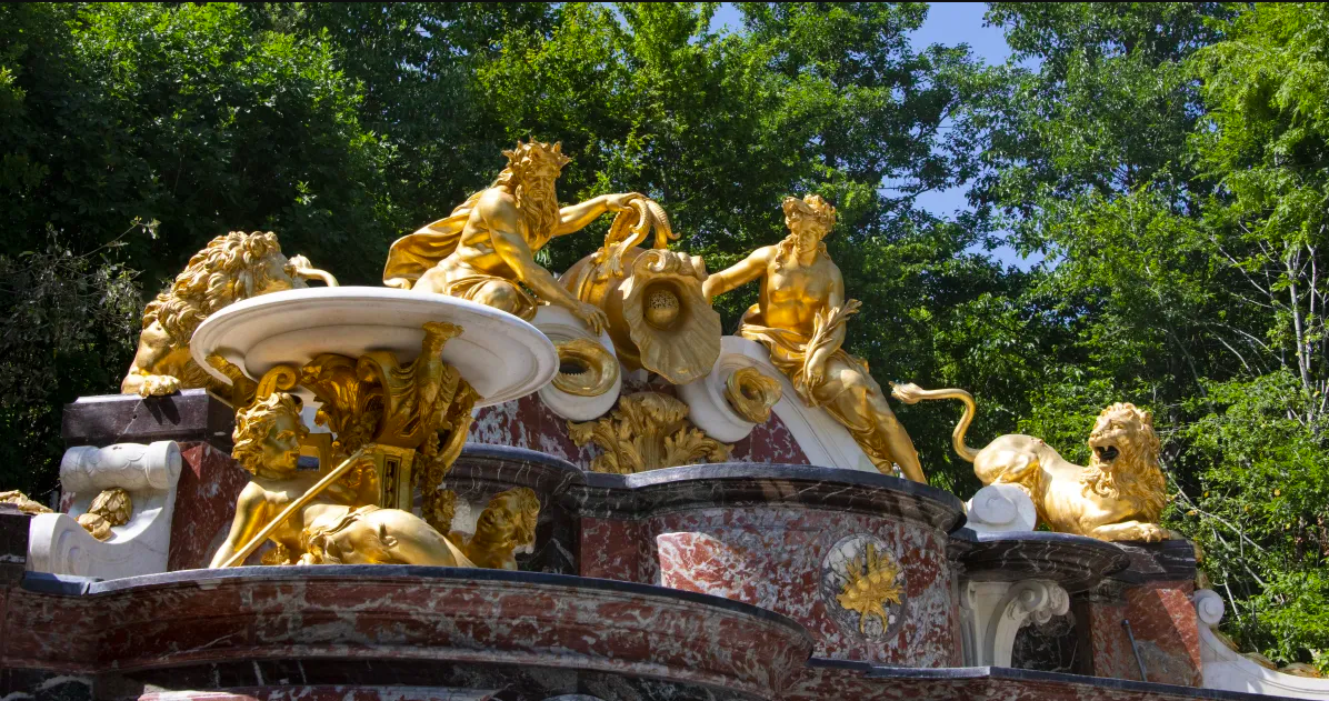 Vue d'ensemble du Buffet d'Eau après restauration, nymphes dorées versant de l'eau entourées d'animaux.